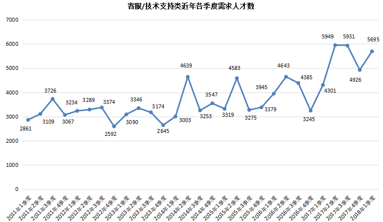6. 客服/技术支持类职位人才需求量为5695人,与上年同期的4301相比增加1394人,同比大幅增长32.41%。