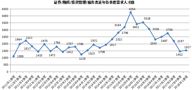 7. 证券/期货/投资管理/服务类职位人才需求持续低迷,其人才需求量为1527人,与上年同期的2487相比减少960人,同比大幅下降38.60%。