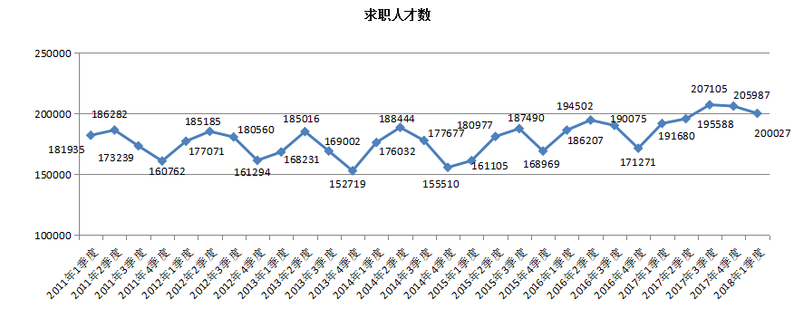 2018年第一季度,广西人才网联系统的求职人才数达到200027人,人才供应小幅增长,同比涨幅为4.35%。