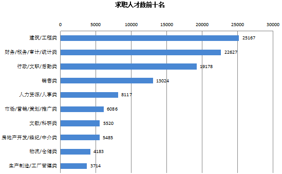 1. 位居求职榜前十名的职位:建筑/工程类、财务/税务/审计/统计类、行政/文职/后勤类、销售类、人力资源/人事类、市场/营销/策划/推广类、文教/科研类、房地产开发/经纪/中介类、物流/仓储类及生产制造/工厂管理类等职位类型。这十个职位类型的求职人才数量总计113101人,合计占比达到56.54%。其中,建筑/工程类、财务/税务/审计/统计类及行政/文职/后勤类这三类职位类型的求职人才数稳居前三位,均超过19000人。
