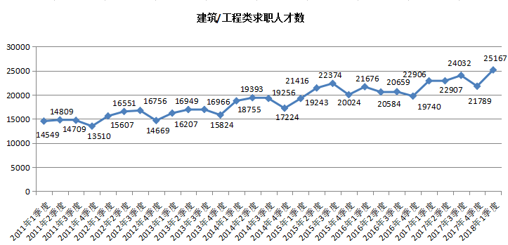 2. 建筑/工程类职位的求职人才数为25167人,创历史新高,与去年同期相比增长2261人,同比涨幅为9.87%。