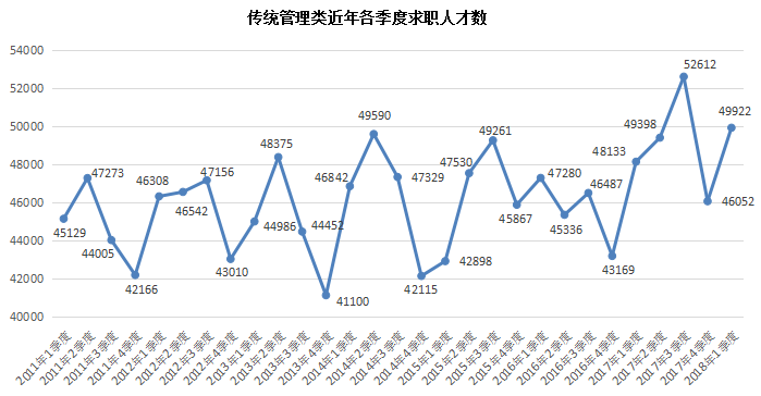 3. 三大传统管理类职位的人才供应量回暖,其求职人才数为49922人,与上年同期相比增长1789人,同比小幅增长3.72%。