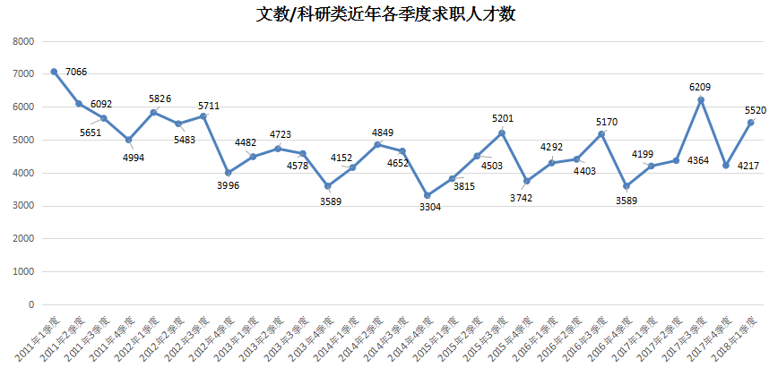 4. 文教/科研类职位的人才供应量同比涨幅较大,其求职人才数为5520人,与上年同期相比增加1321人,同比涨幅达到31.46%。