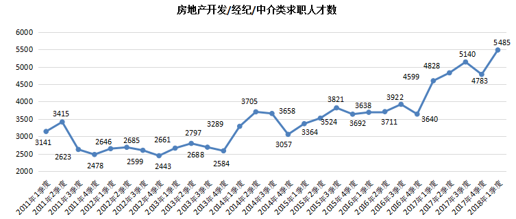 2018年第一季度,广西人才网联系统中房地产开发/经纪/中介类职位的人才供应量创历史新高,其求职人才数为5485人,与上年同期相比增加886人,同比涨幅达到19.27%。