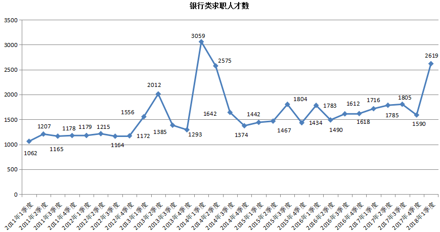 2018年第一季度,广西人才网联系统中银行类职位的人才供应量继2014年第一季度后,再次出现突破性增长形态,其求职人才数为2619人,与上年同期相比增加903人,同比涨幅高达52.62%。