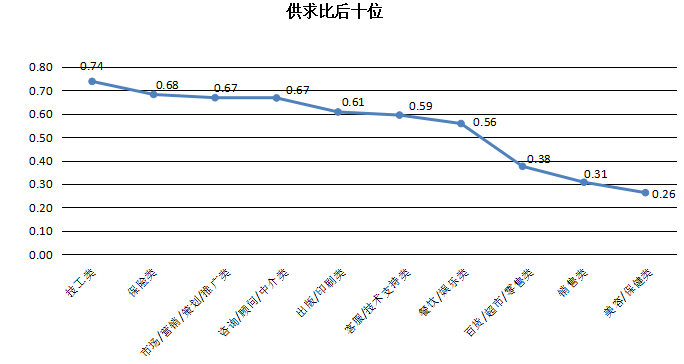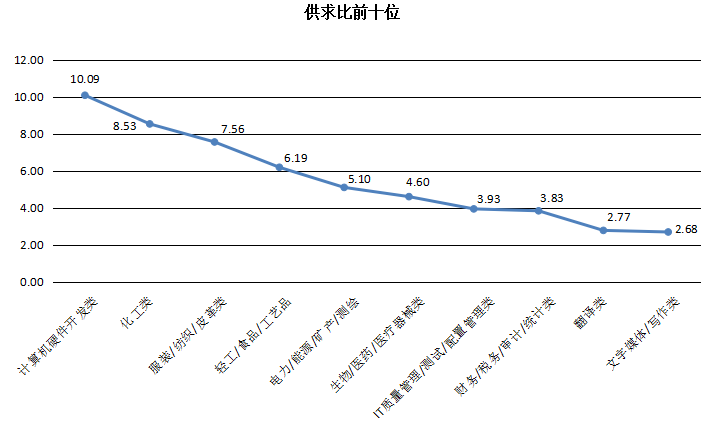 其中,由于需求极少,计算机硬件开发类、化工类及服装/纺织/皮革类等职位就业竞争压力较大,其供求比分别高达10.09、8.53及7.56,位居供求比前三位;而服务业三类职位和销售类等职位由于人员流动性大等特征,需求长期旺盛,供求比长期位居供求比后十位,其合计供求比分别仅为0.42和0.31。